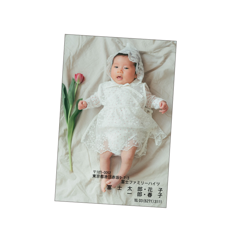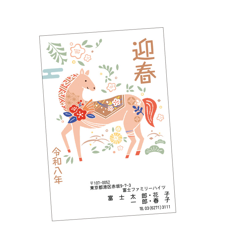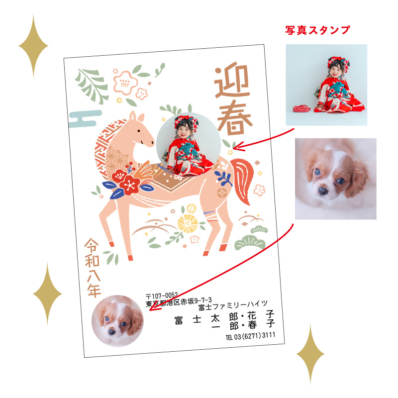 イラストに座った写真を組み合わせれば、 干支の馬に乗っているようでもっと楽しい! ペットの写真を追加しても、会った時の会話がはずみますね。 「画像追加」機能で写真を追加してユニークな 年賀状がつくれます。