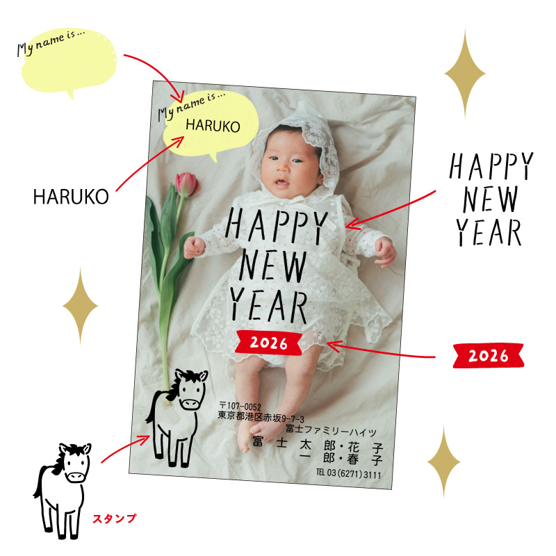 スタンプを使ってアレンジ!今年も気持ちが伝わるスタンプをたくさん追加しています。 使いたくなる便利なスタンプで、世界に一つだけのオリジナル年賀状がつくれます。