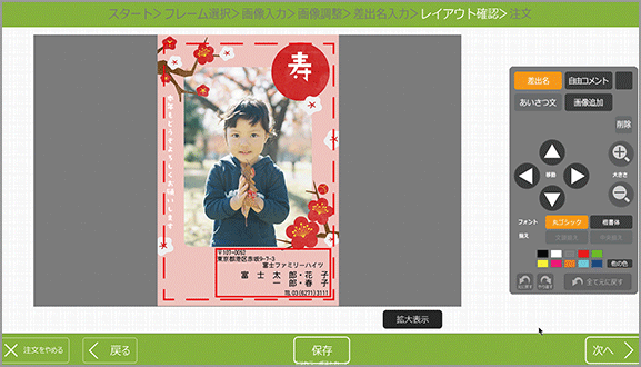あいさつ文も例文から選んで文章を変更したり、サイズ・色・フォントも変更できます。